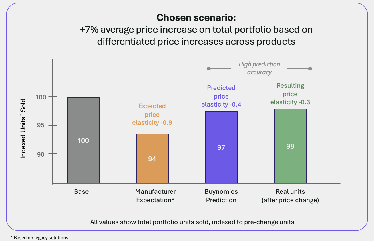 The Approach: To model different price change scenarios, the manufacturer provided sell-in data, segmented by hospitality (hotels, restaurants, cafes, bars) and non hospitality buyers, to the Buynomics team to train its proprietary Virtual Shoppers AI.